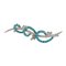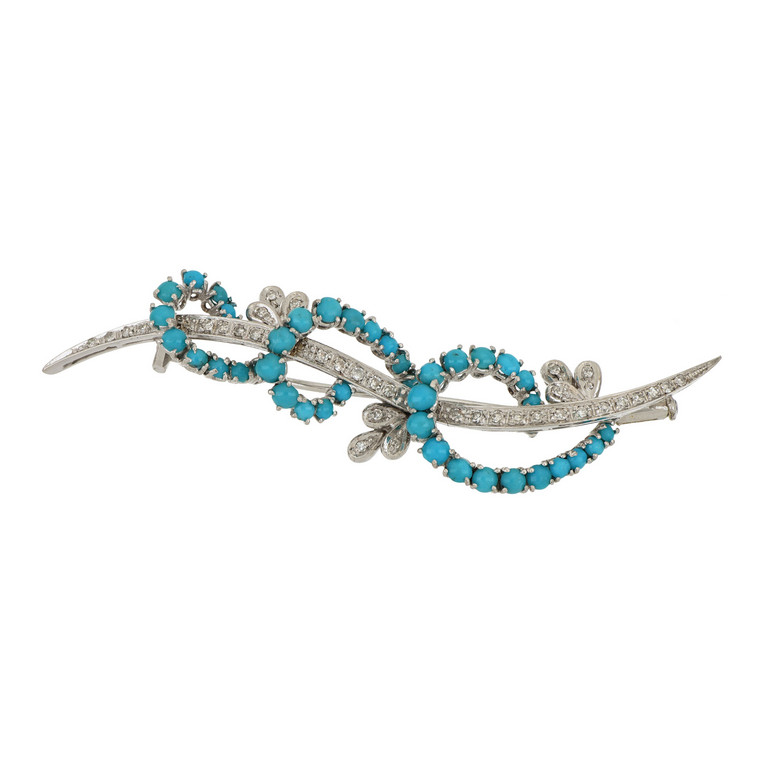 Spilla in oro bianco a vago motivo floreale piccoli diamanti e turchesi sul tralcio con volute.
