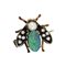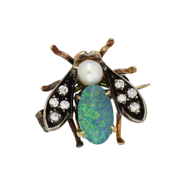 Spilla in oro giallo e bianco piccoli diamanti sulle ali una perla e una pietra opaleggiante arlecchino stilizzano una mosca portafortuna.