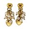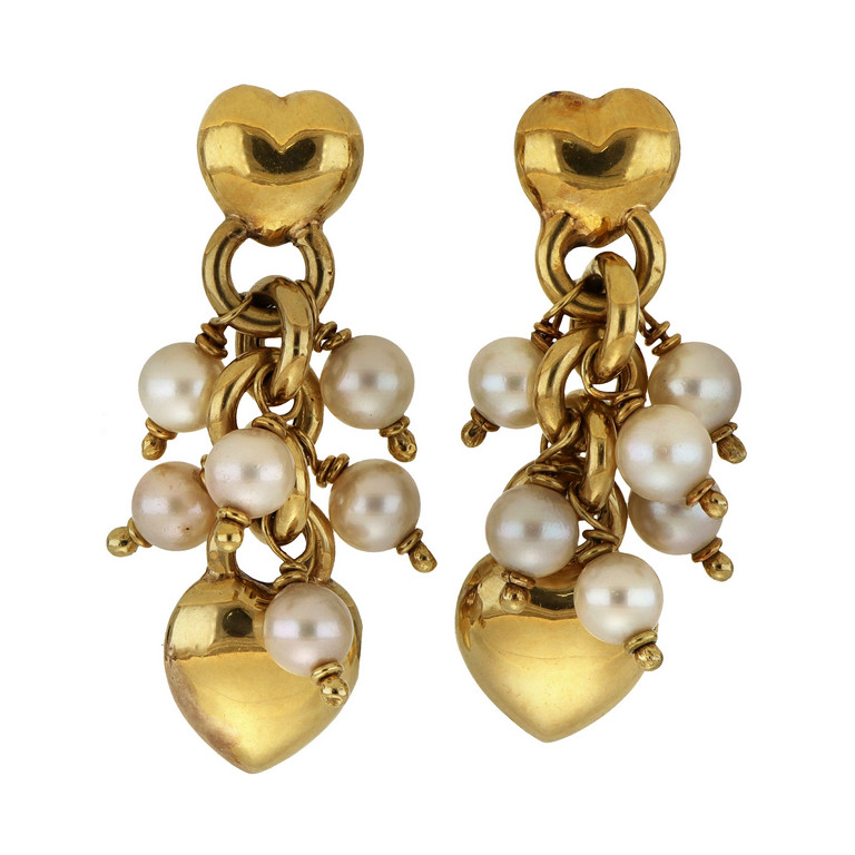 Orecchini pendenti in oro giallo con ciondoli a cuore e perle coltivate.