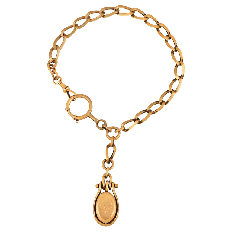 Bracciale in oro rosso a catena pendente di forma ovale con mistero piccolo reliquiario incisi monogrammi GBV.