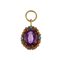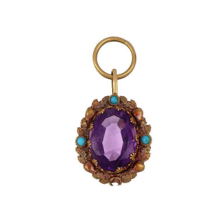 Ciondolo di forma ovale in oro giallo con al centro quarzo ametista e piccoli turchesi.