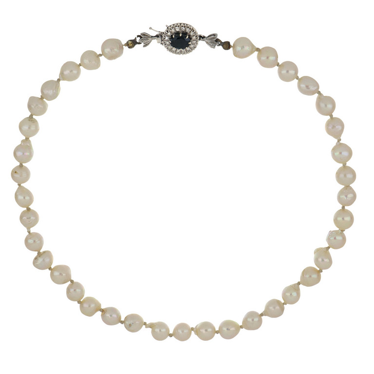 Girocollo di perle coltivate semibarocche con chiusura in oro bianco con diamanti e zaffiro.
