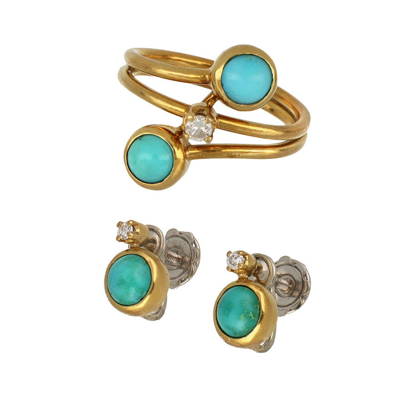 Lotto composto da un paio di orecchini in oro giallo e bianco con turchesi e diamantino e un anello in oro giallo a contrariè con turchesi e piccolo diamante al centro.