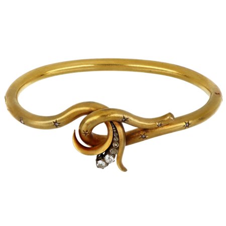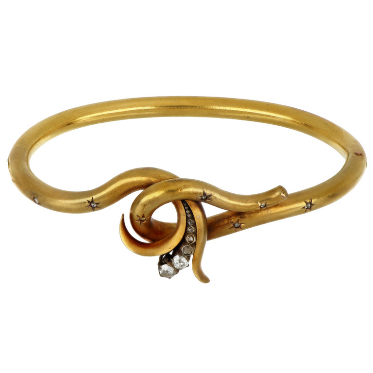 Bracciale semirigido a canna vuota in oro giallo di antica manifattura piccoli diamanti taglio antico sul gambo e sul nodo centrale lavorato con doratura 24k.