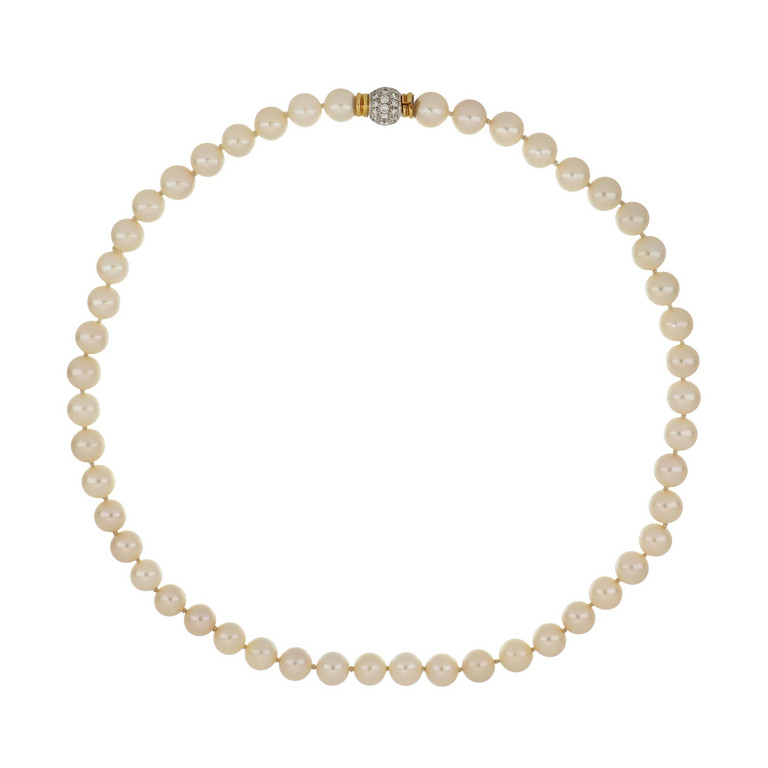 Collana girocollo di perle giapponesi coltivate chiusura a pallina in oro bianco e giallo con diamati.