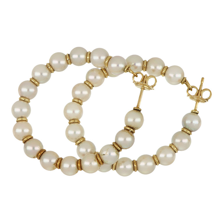 Orecchini ad anella in oro giallo con perle coltivate (6 mm.) e distanziali circolari.