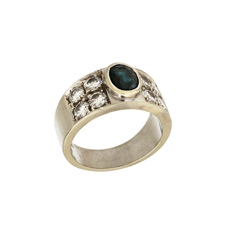Anello a fascia piena in oro bianco 8 diamanti taglio brillante per ct. 1 50 ca. fiancheggiano uno zaffiro taglio ovale blu intenso di ct. 1 10 ca.