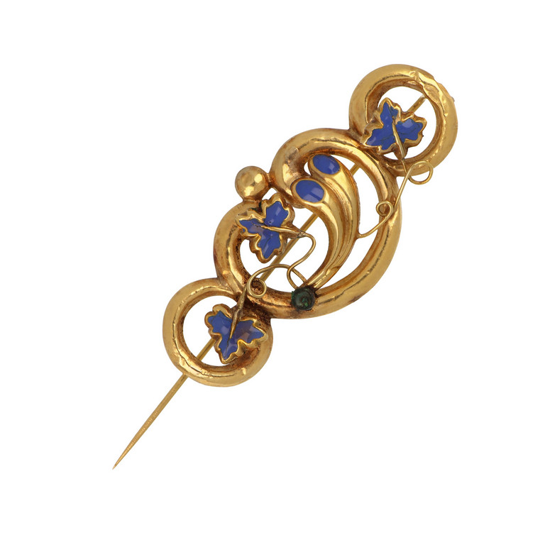 Spilla in oro giallo a canna vuota raffigurante un tralcio di edera con smalti bluette.