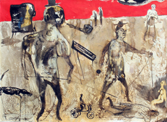 PERRONI Marco Como 1970 Acrobati e claudicanti, 1997 tecnica mista su carta intelata cm. 65.5 x 89.5 Firma, data 'Perroni, 97' (in basso a sinistra) #Etichetta della Poleschi Arte, Lucca (al retro) Autentica dell'artista su fotografia