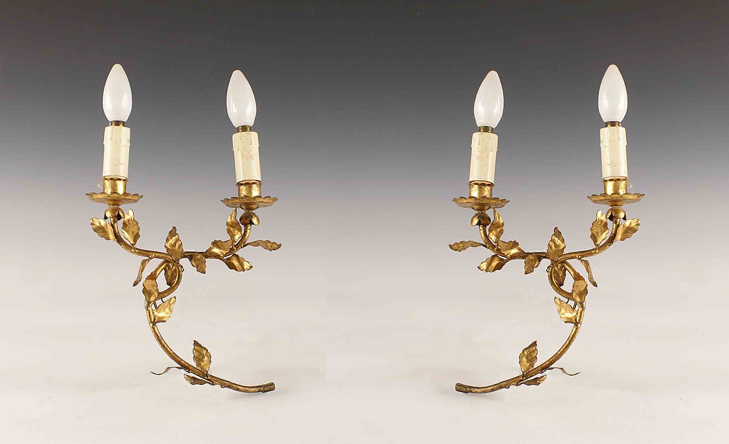Coppia di appliques a due luci in ferro battuto e dorato, vecchia manifattura, h. cm. 33.
