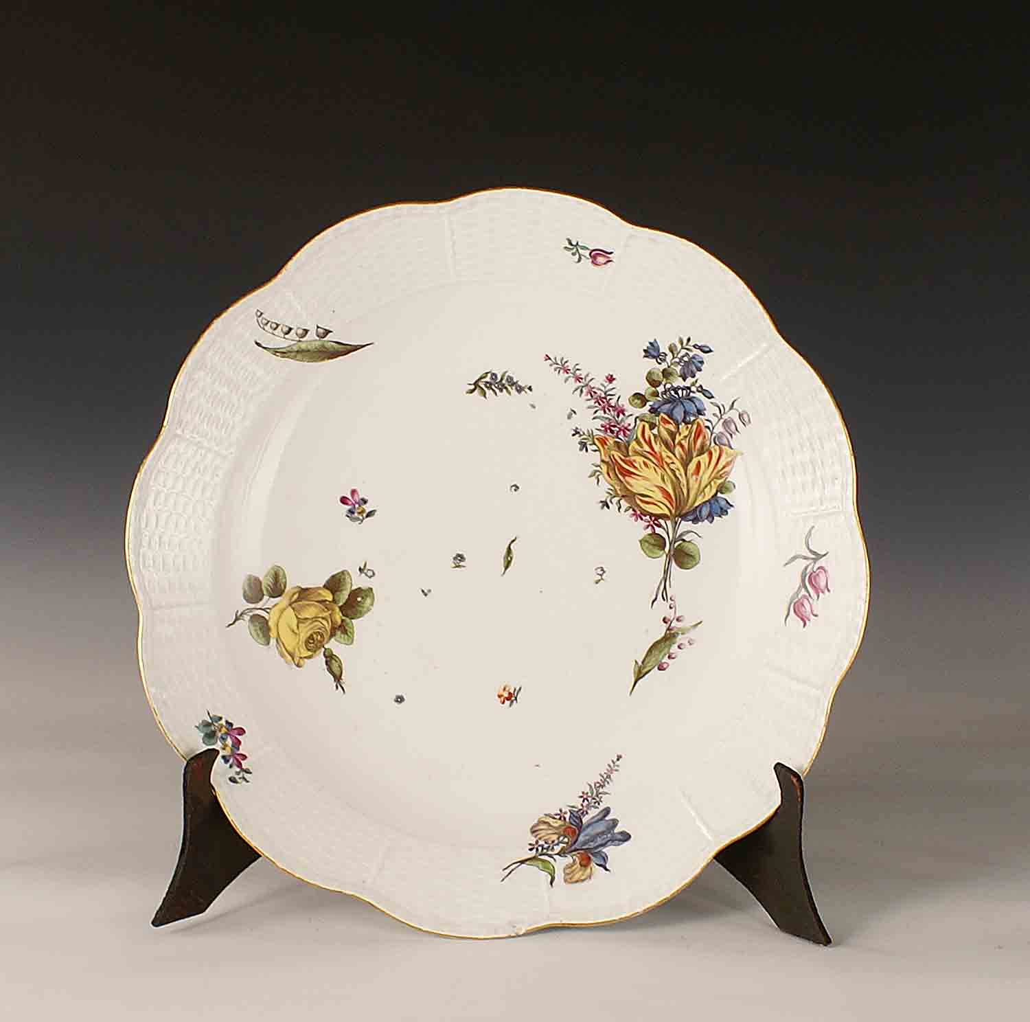 Grande piatto in porcellana dipinta a policromia e decorata a motivo floreale, Meissen, vecchia manifattura, d. cm. 44 (lievi difetti).