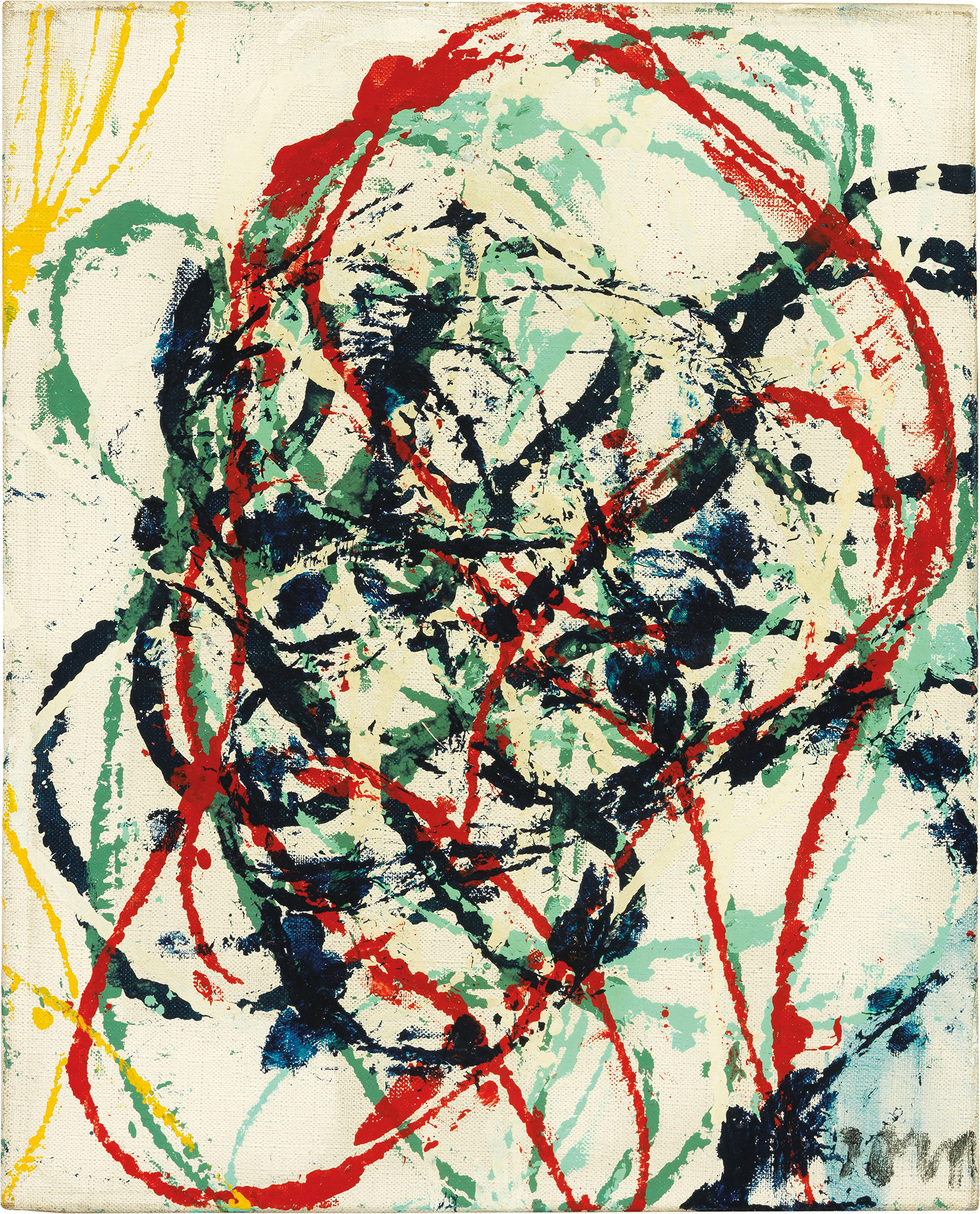 Firma in basso a destra: Jorn; firma e data al verso sulla tela: Jorn / 61: etichetta Fidesarte con dati dell'opera; sul telaio: etichetta Arthur Tooth & Sons / Old Masters & Modern Paintings / London, con n. 9316: etichetta Mostra «Arte e Contemplazione» / Palazzo Grassi - Venezia - 1961: timbro Societé Henry & Fils / Paris.