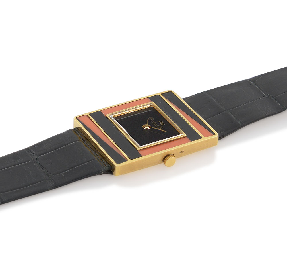 Dim. mm 31x25. C. rectangular, 18K yellow gold with onix and coral, case back secured by screws, sapphire crystal (very good). D. onix (original, very good). M. manual winding (very good). Dial, case and movement signed. Accompanied by IWC buckle and box.
