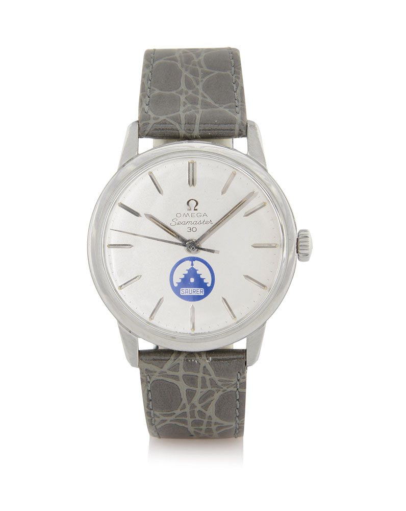Diam. mm 35. C. stainless steel with screwed case back (very good). D. silvered with applied indexes, centre seconds and Saurer logo (original, very good). M. manual winding (good). Dial, case and movement signed.