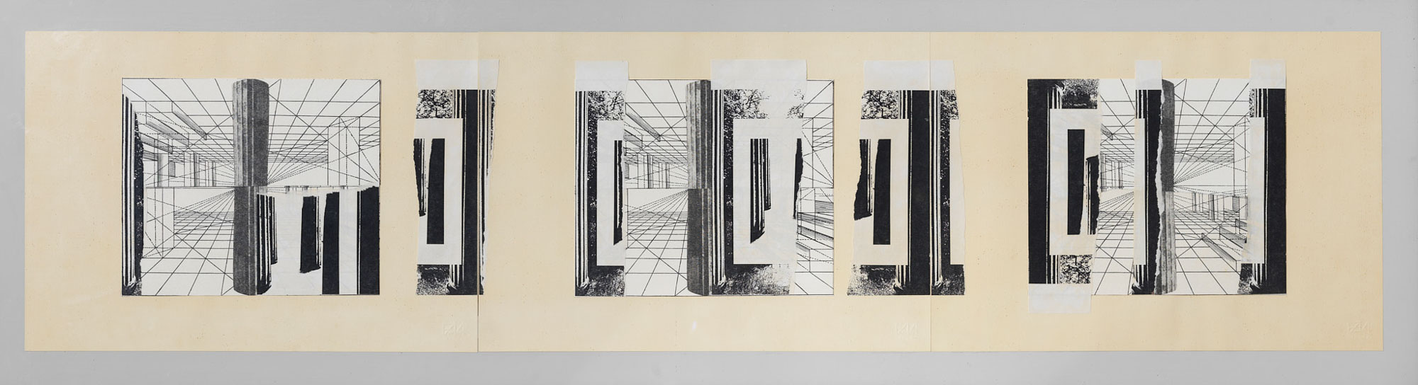 Collage su tre carte applicate su tavola, cm. 34 x 47,7 cad. (totale cm. 34 x 143,1)