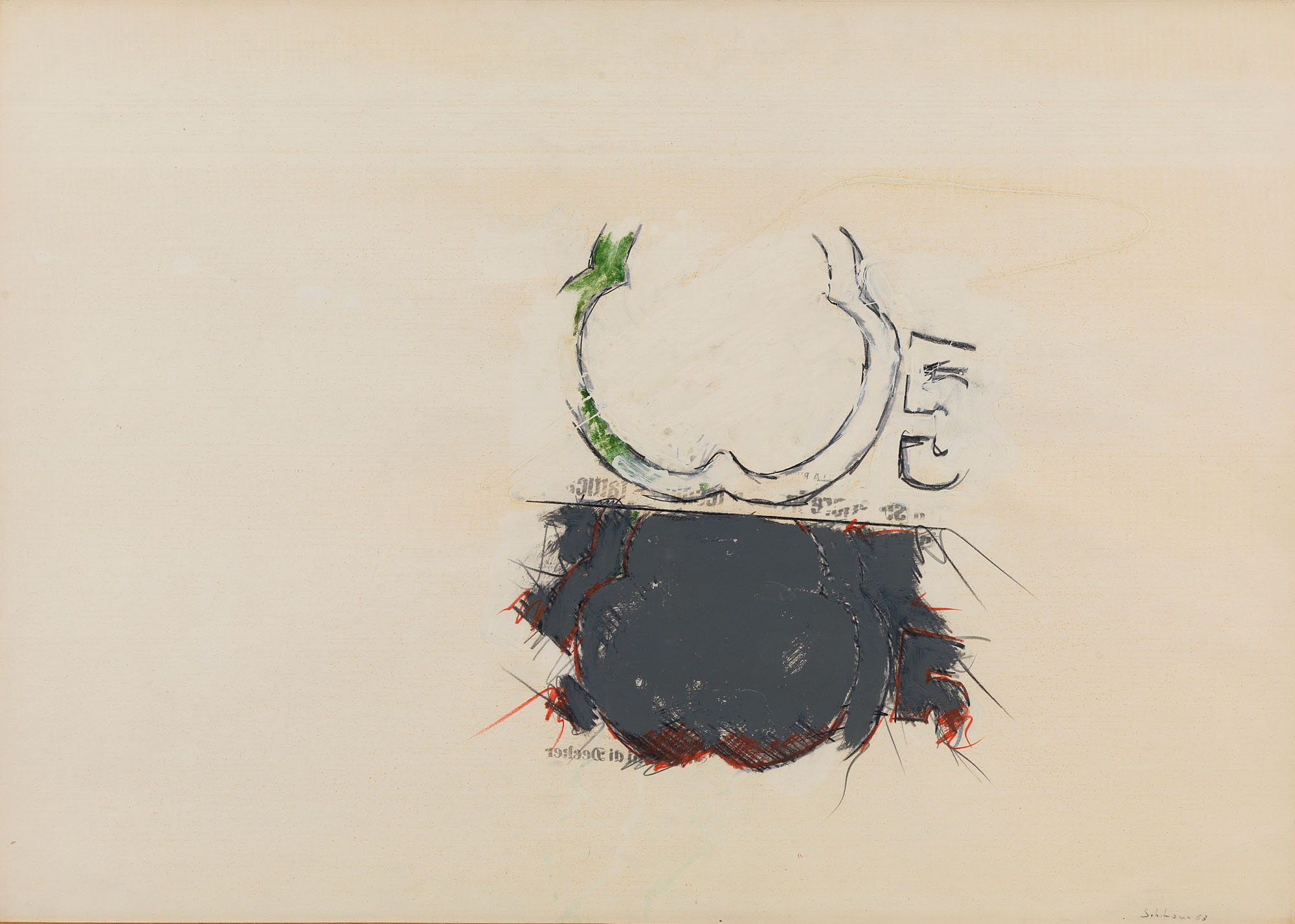 Smalto, grafite, pastello e riporto con trielina su cartoncino, cm. 70 x 100