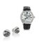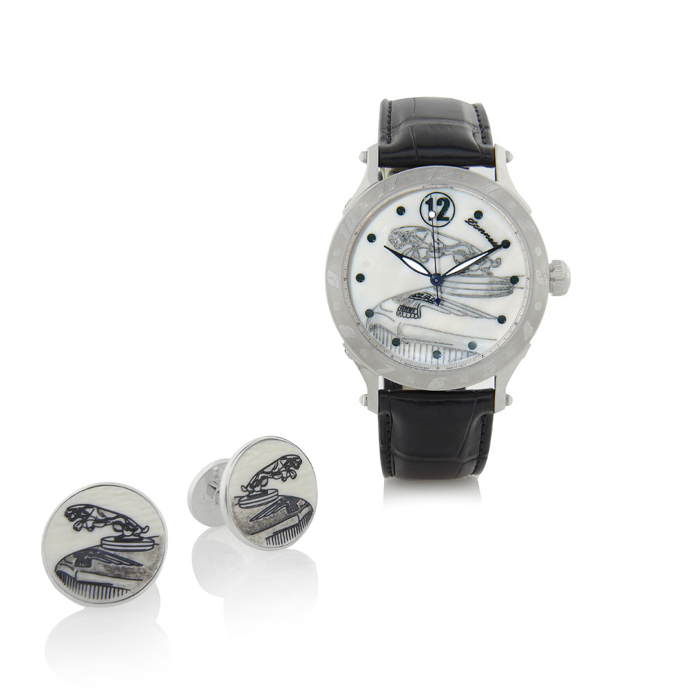 Cassa in acciaio con oblò decentrato sul fondello chiuso da viti, lunetta con numeri arabi incisi e vetro zaffiro (inusato). Quadrante in avorio inciso e dipinto raffigurante parte di cofano di una Jaguard, indici e numero 12 incisi e dipinti, secondi al centro (come nuovo). Movimento a carica automatica (come nuovo). Quadrante, cassa e movimento firmati. Completo di cinturino, fibbia double-deployante in acciaio originali, astuccio e certificato. Coppia di polsini "en suite" di forma circolare, in argento e avorio con uguale raffigurazione in smalto. Completi di astuccio originale.