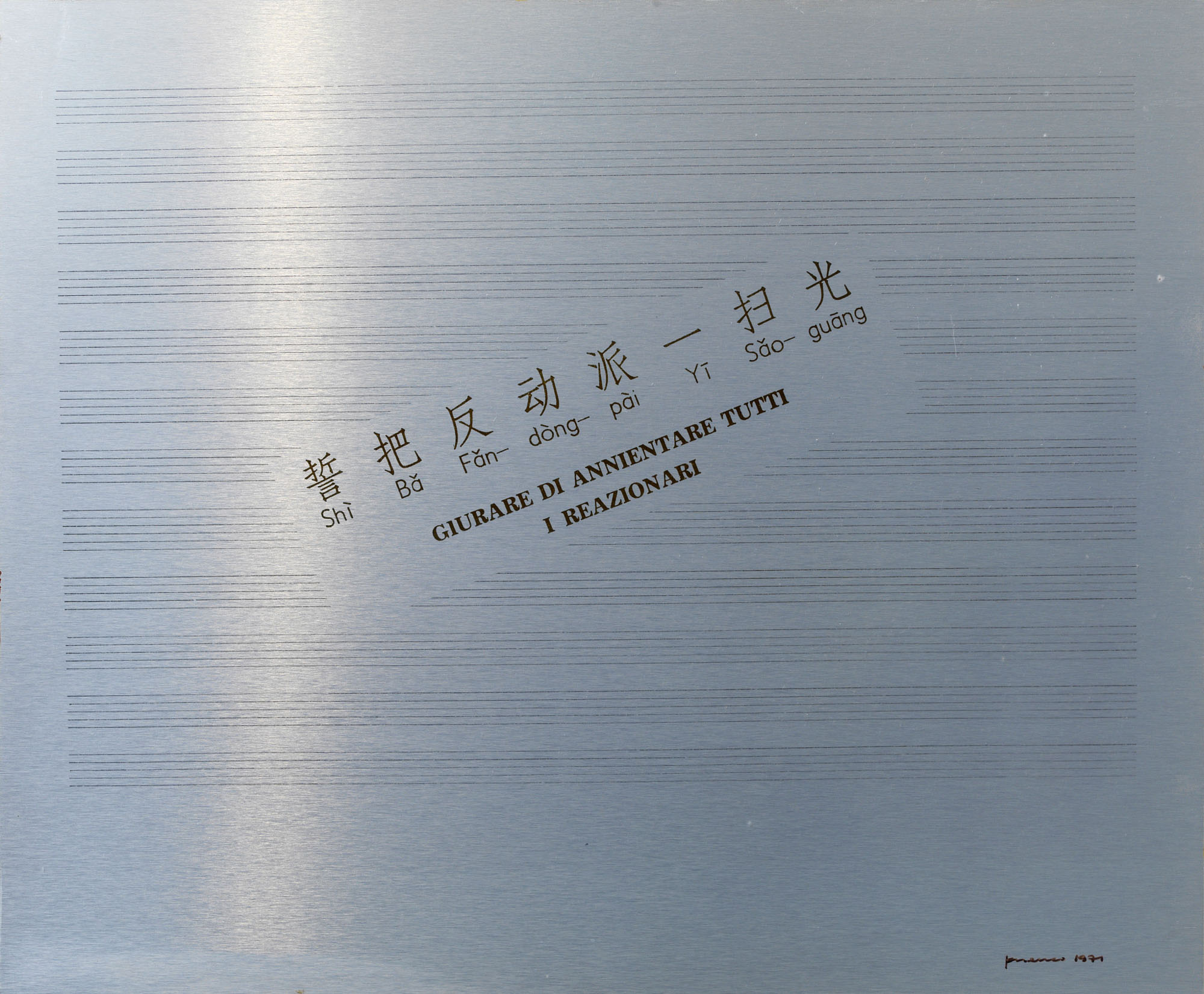 Serigrafia su lamina metallica applicata su tavola, cm. 49 x 59