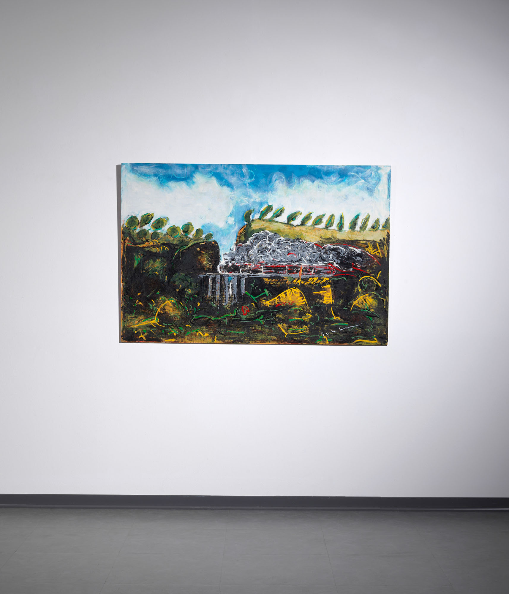 Lotto 386 | MARIO SCHIFANO Quadro severo con trenino allegro,