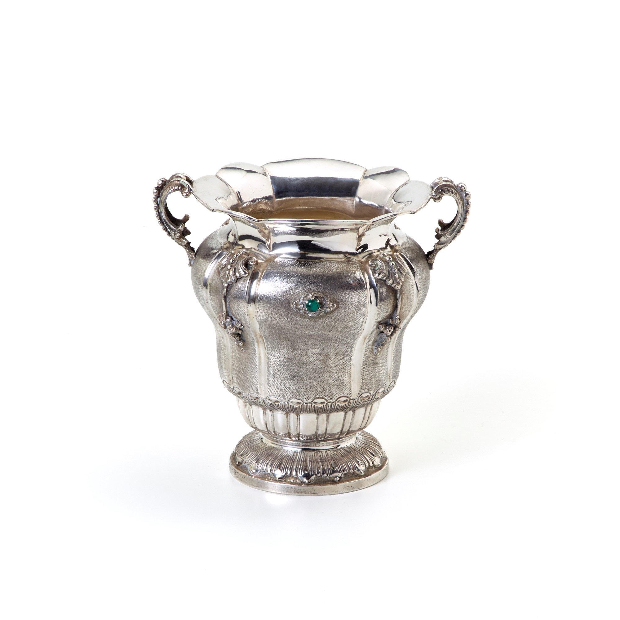 Silver ice bucket decorated with floral motifs and malachite cabochon