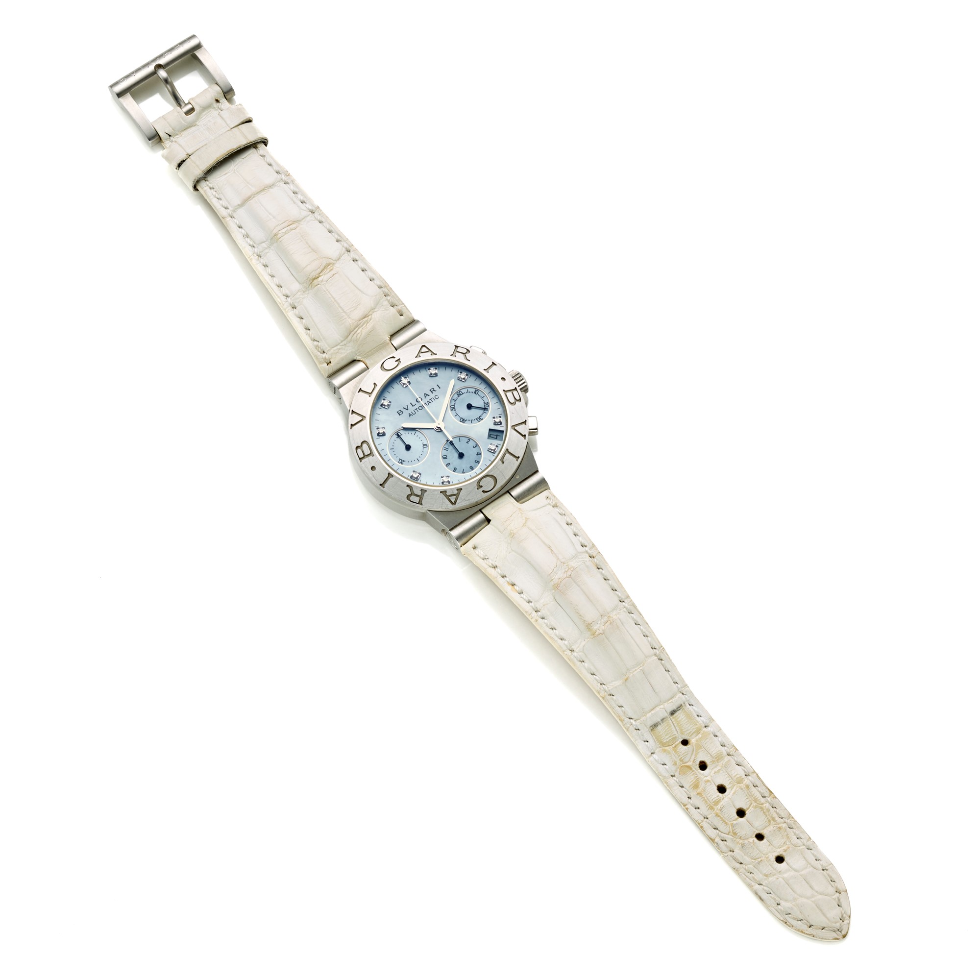 Bulgari, ref. CH35S, year 2000. Stainless steel case, mother-of-pearl dial with diamond indexes, original white crocodile strap and original stainless steel buckle. Self-winding movement, chronograph. Dial, movement and case signed. Very good condition. Case 35 mm