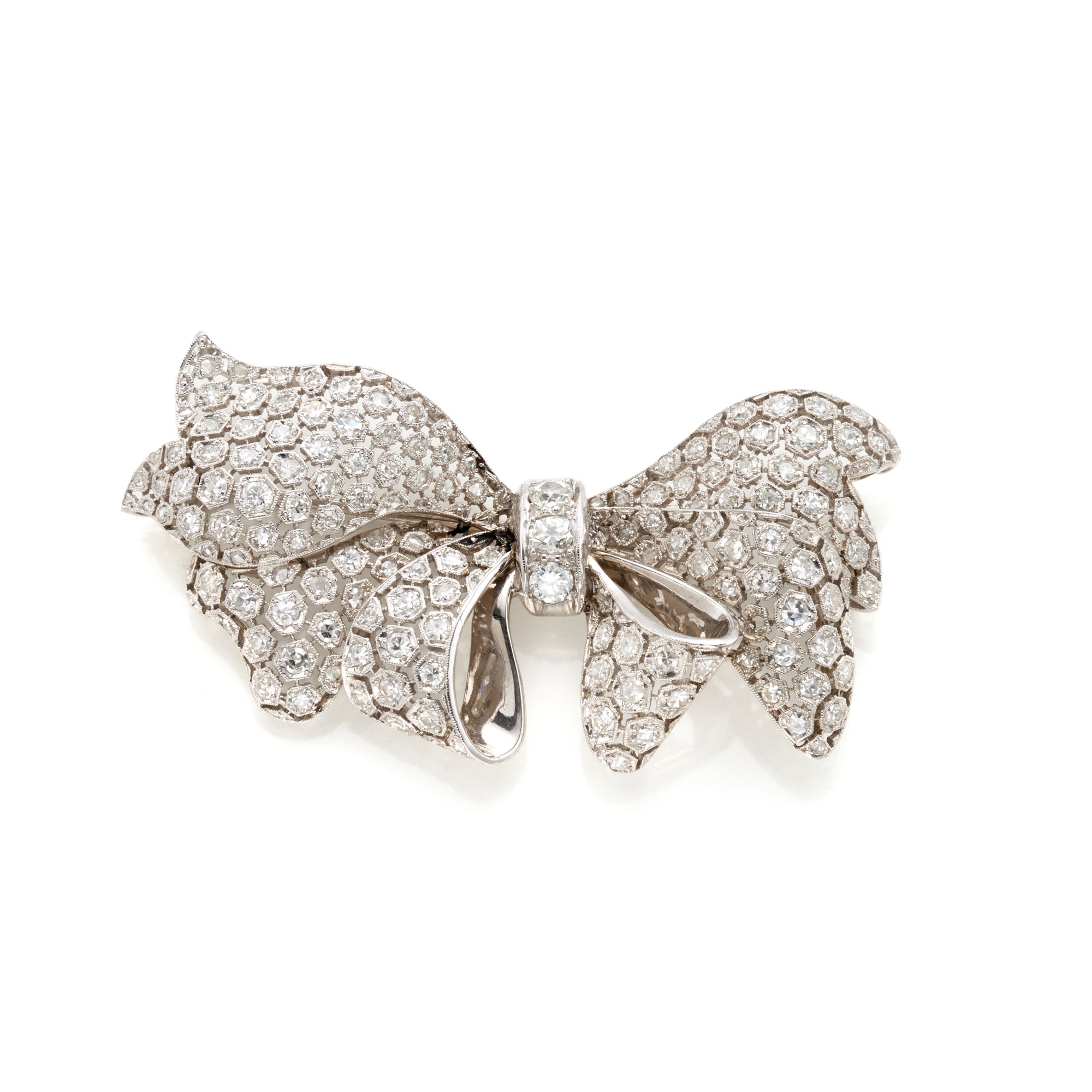 Spilla a fiocco in platino con diamanti rotondi per complessivi 1,70 ct circa