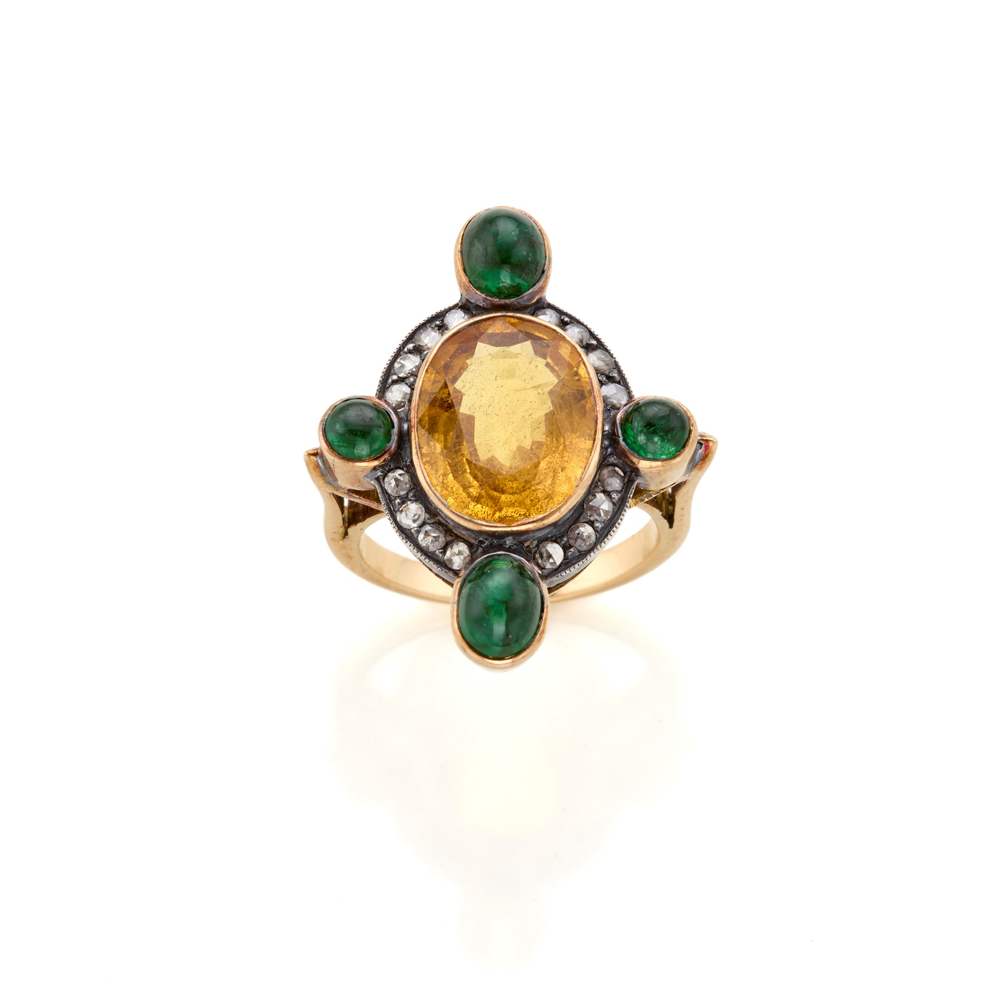 Anello in oro rosa 18 Kt e argento con corindone giallo ovale del peso di circa 6,40 ct, smeraldi cabochon e diamanti mezza rosetta