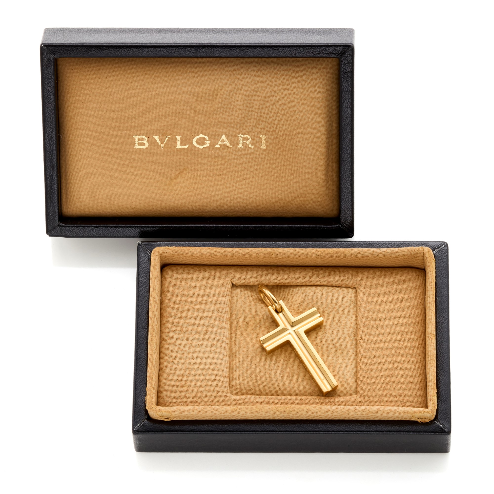 Pendente a croce firmato Bulgari in oro giallo 18 Kt corredato di scatola...