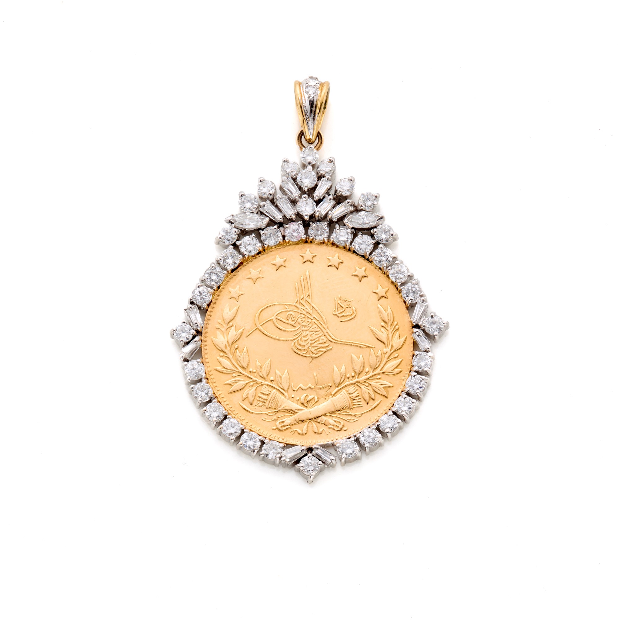 Pendente in oro giallo e bianco 18 Kt con moneta ottomana in oro giallo 22 Kt e diamanti rotondi, marquise e tapered per complessivi 1,10 ct circa