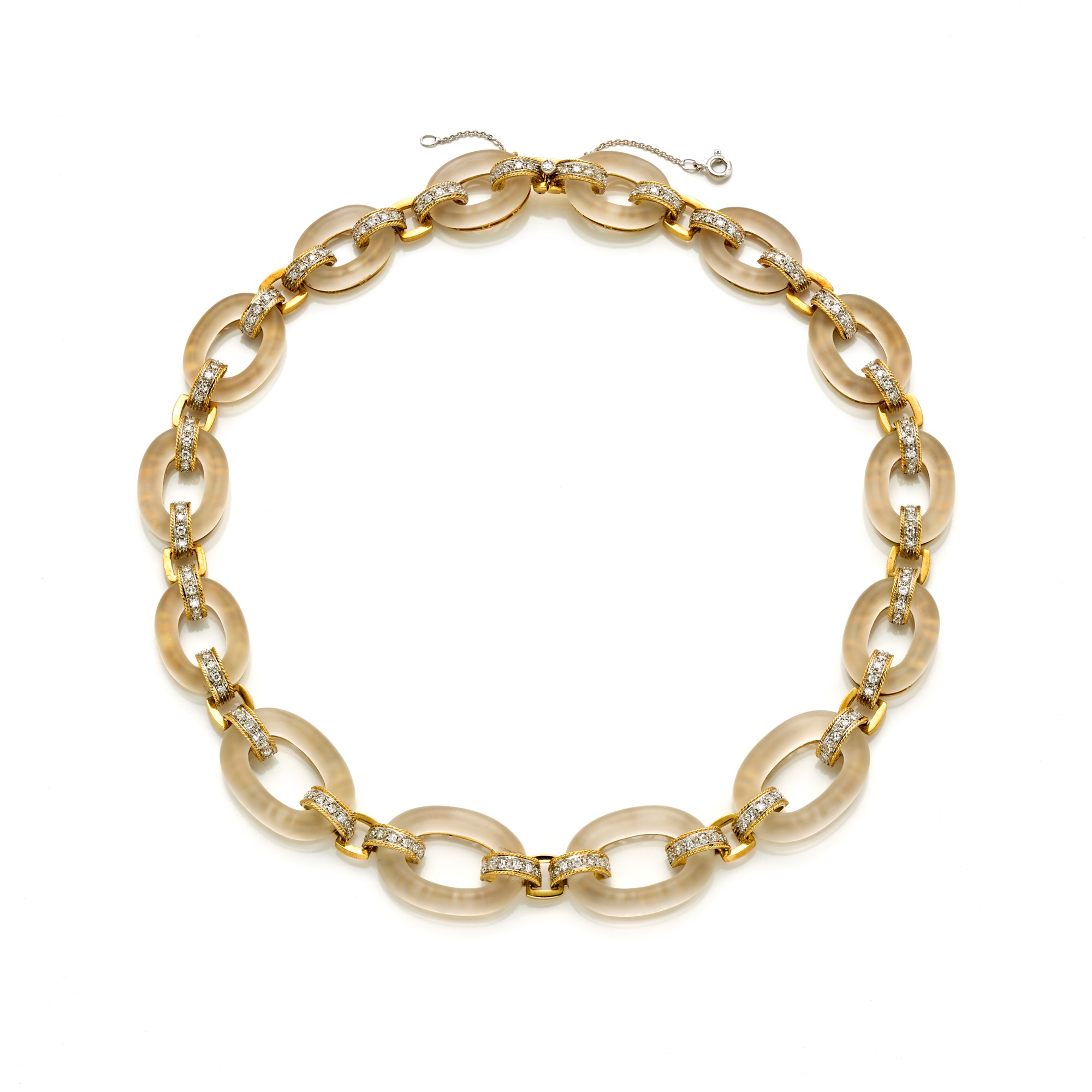 Collier in oro giallo e bianco 18 Kt con diamanti rotondi per complessivi circa 2,85 ct e quarzo ialino satinato