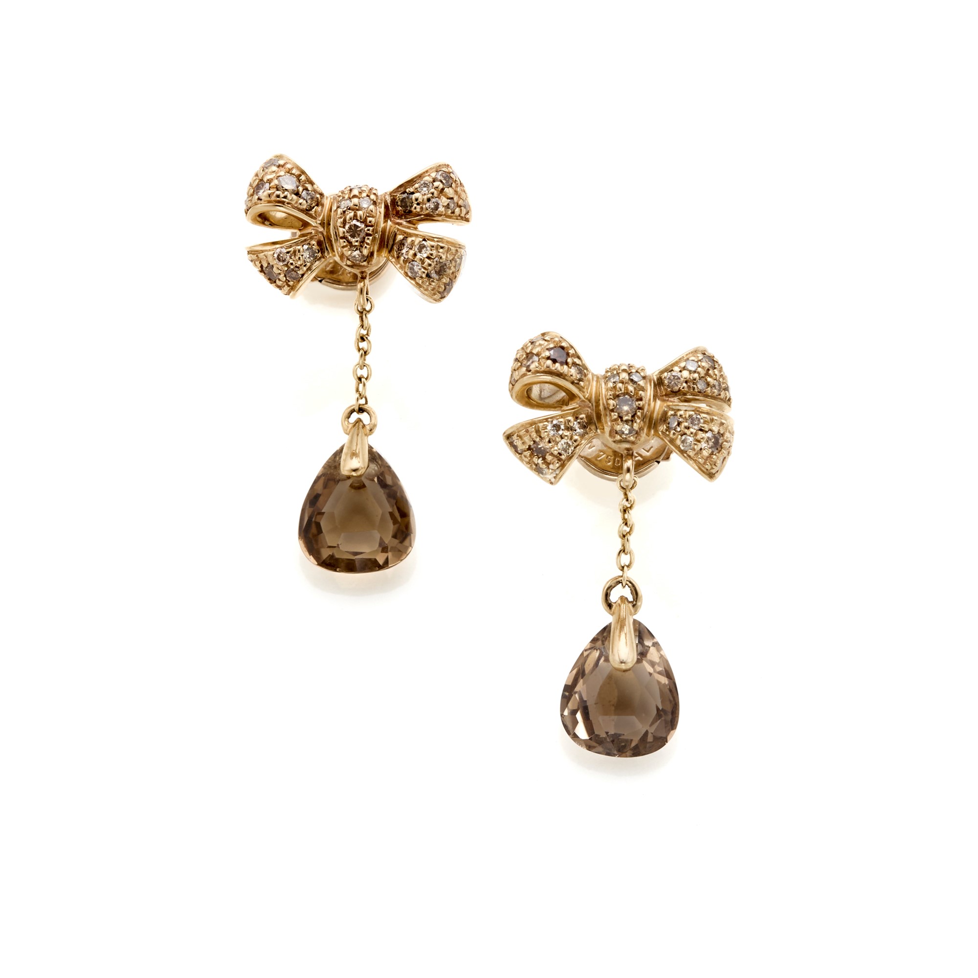 Pomellato pendant earrings, Forever collection, in 18 Kt pink gold with round fancy diamonds totalling approximately 0,55 ct and two pear-shaped smoky quartz