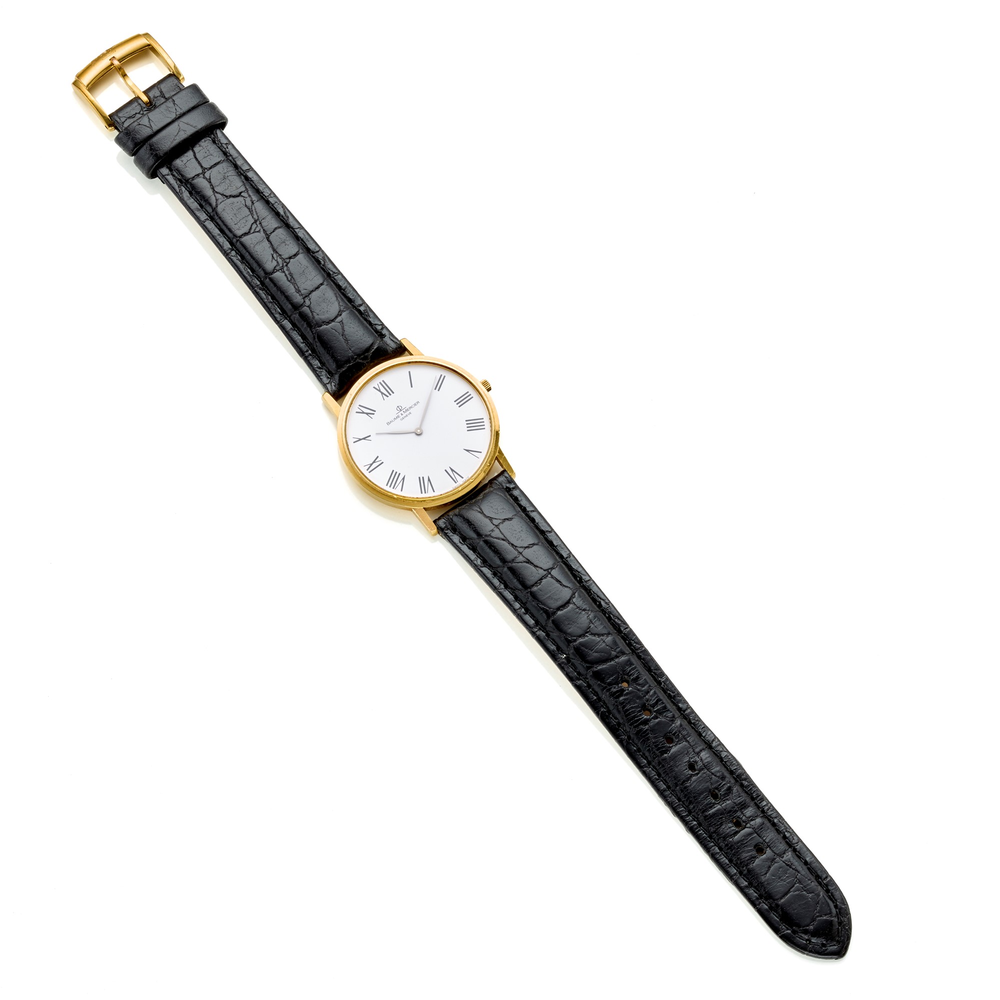 Baume & Mercier, ref. MV045088, 1990s. 18 Kt yellow gold case, with black leather strap and original gold-plated buckle. Quartz movement. Signed dial and case. Fair condition, servicing required. Case 32 mm