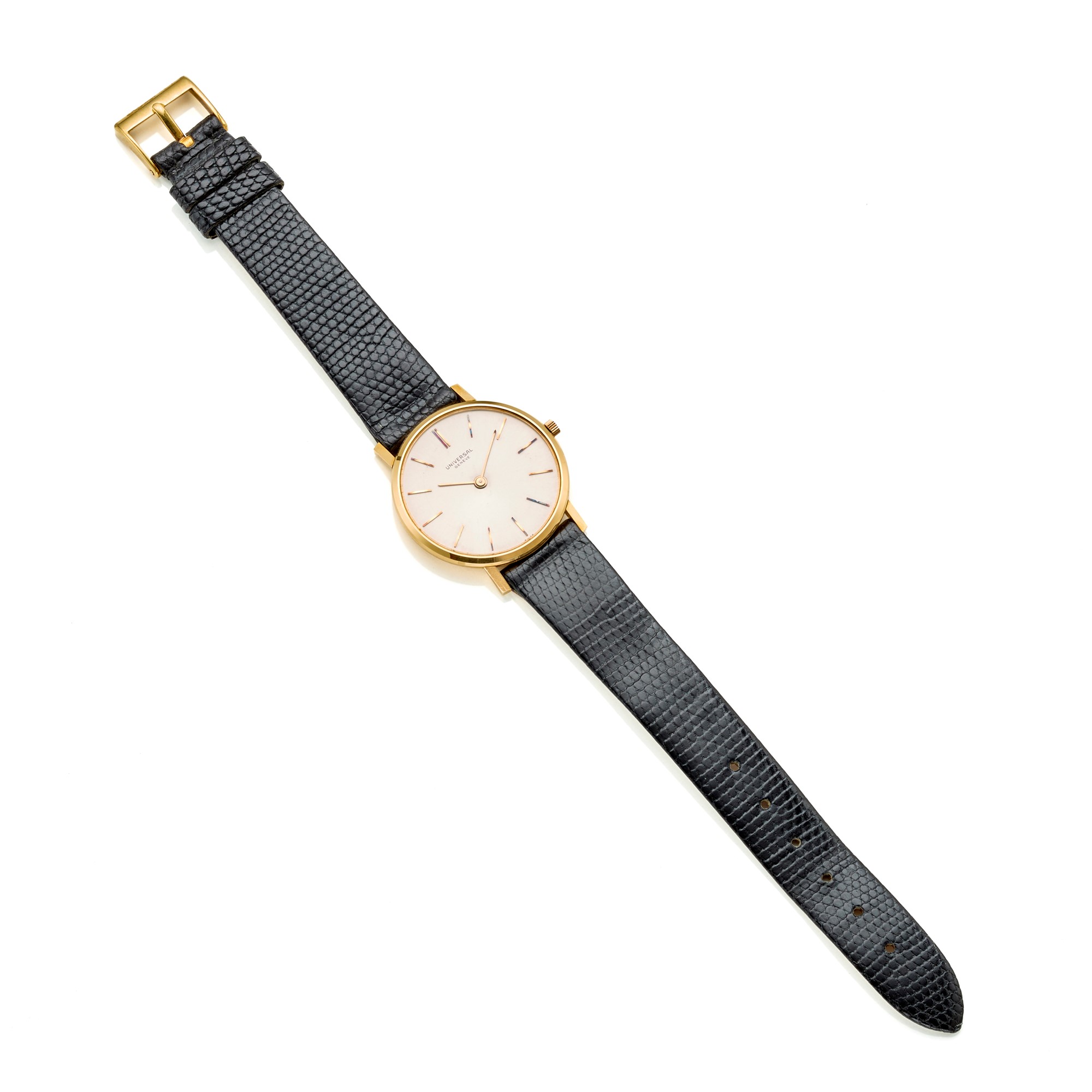 Universal, ref. 53995, anni '80. Cassa in oro giallo 18 Kt, con cinturino in pelle nera e fibbia in oro 18 Kt. Movimento a carica manuale. quadrante e movimento firmati. Discrete condizioni, necessita di revisione . Cassa 31 mm