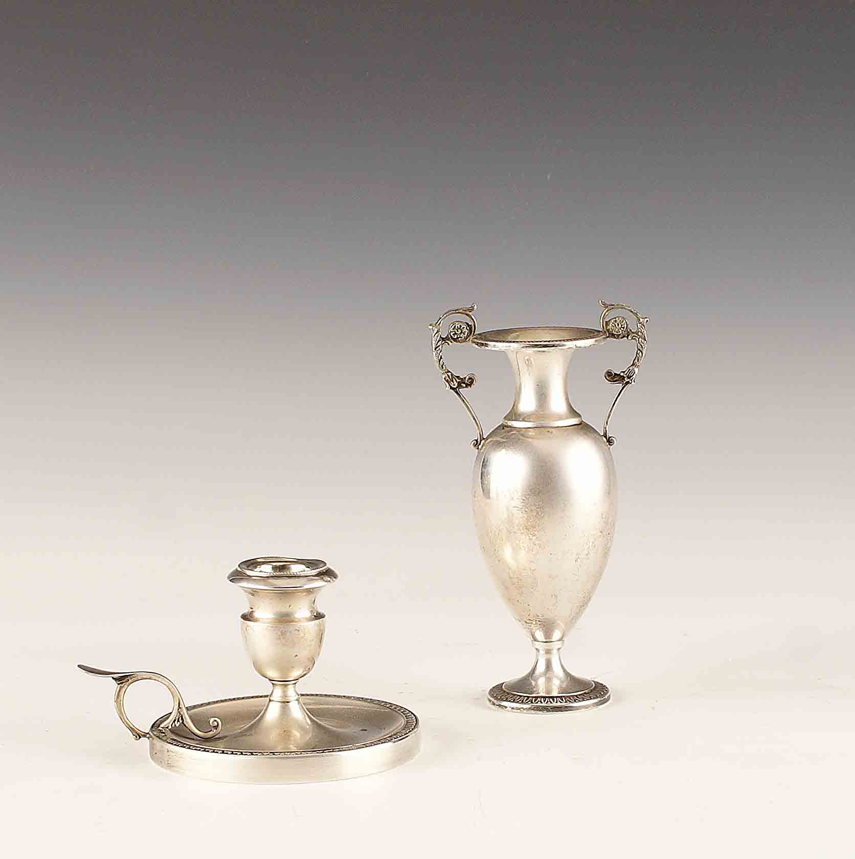 Lotto composto da una bugia ed un vasetto entrambi in argento, gr. 234 complessivi.