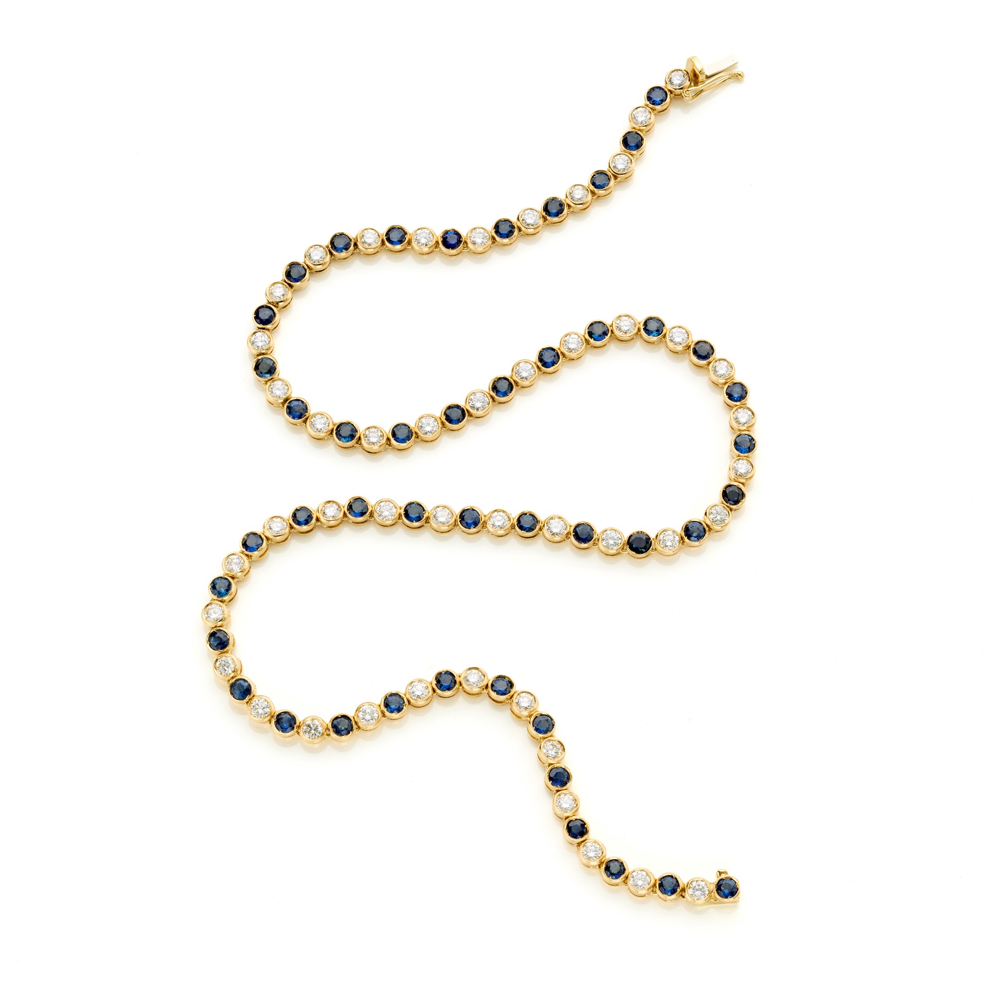 18 Kt yellow gold necklace mounting round diamonds totalling approx. 6 ct and round sapphires totalling approx. 7,80 ct