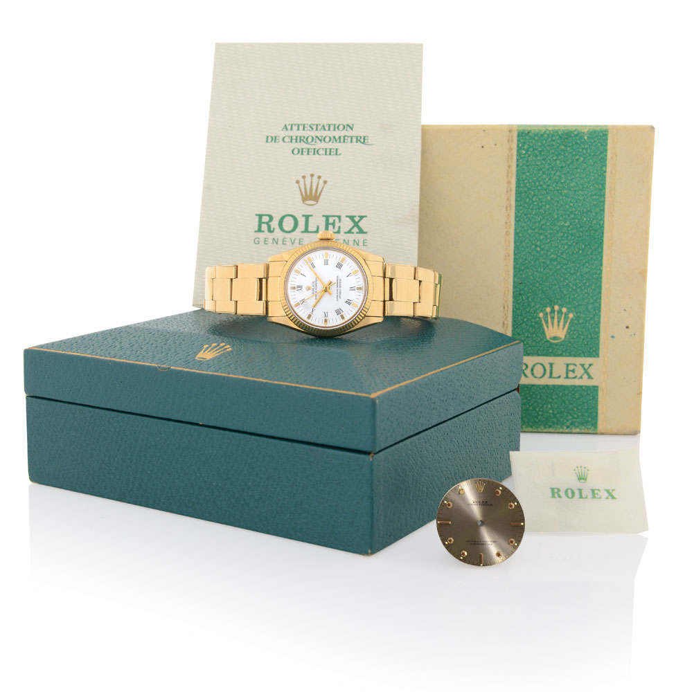 Diam. mm 30. C. 18K yellow gold with screwed case back and crown, reeded bezel (very good). D. white with applied indexes and painted Roman numerals, centre seconds (original, very good). M. self-winding (very good). 18K yellow gold Oyster bracelet. Dial, case, movement and bracelet signed. Accompanied by Rolex box and certificate, spare dial champagne with applied hexagonal-shaped indexes.