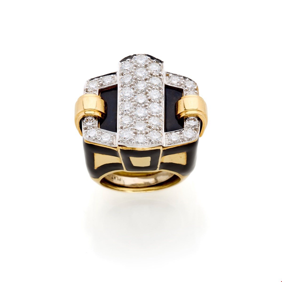 Anello firmato Webb, anni '70 circa, in oro giallo e platino con smalto nero e diamanti rotondi per complessivi circa 2,90 ct
