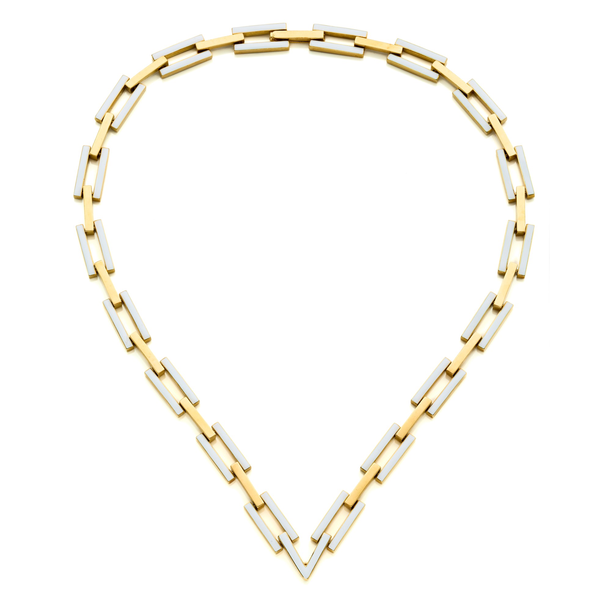 18 Kt 1970s yellow gold and white enamel modular necklace signed Webb