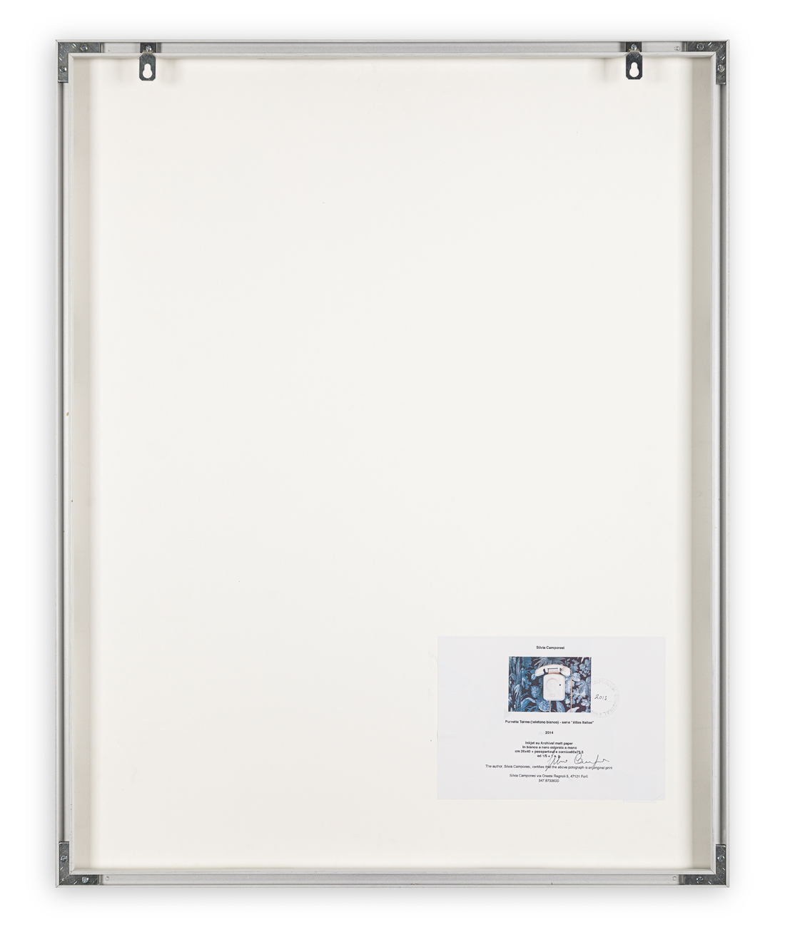 Cartiglio dell'Artista al retro con caratteristiche tecniche dell'opera, indicazione della numerazione (Esemplare 1/5), timbro e datazione