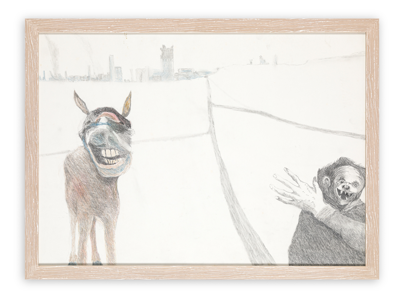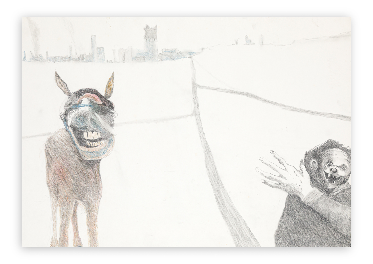 Titolo e iscrizione 'American Civil War: Study 39. Welcome to Charleston! Two time-travelling Goyaesques mislaid and mistimed on their way back to the Quinta del Sordo, find themselves hovering on the approaches to Charleston, Febraury 1865. On the left, Burro ghost no 1, on the right, one of the realized ghost-forms of a figure from Capricho 49' al retro