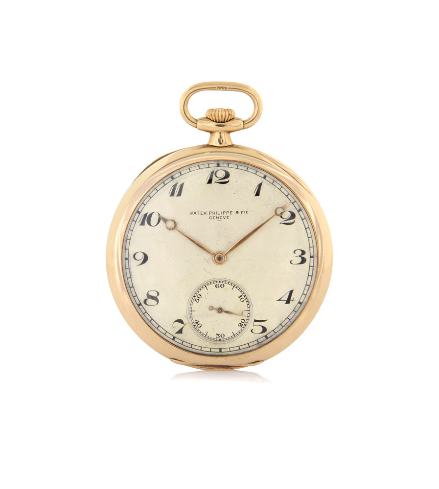 Cassa n. 411851 in oro giallo 18 kt liscia (ottimo). Quadrante argentato con numeri Breguet smaltati, secondi al 6 (originale, ottimo). Movimento n. 804020 con scappamento ad ancora, carica manuale (buono). Quadrante, cassa e movimento firmati. Completo di estratto di registro.