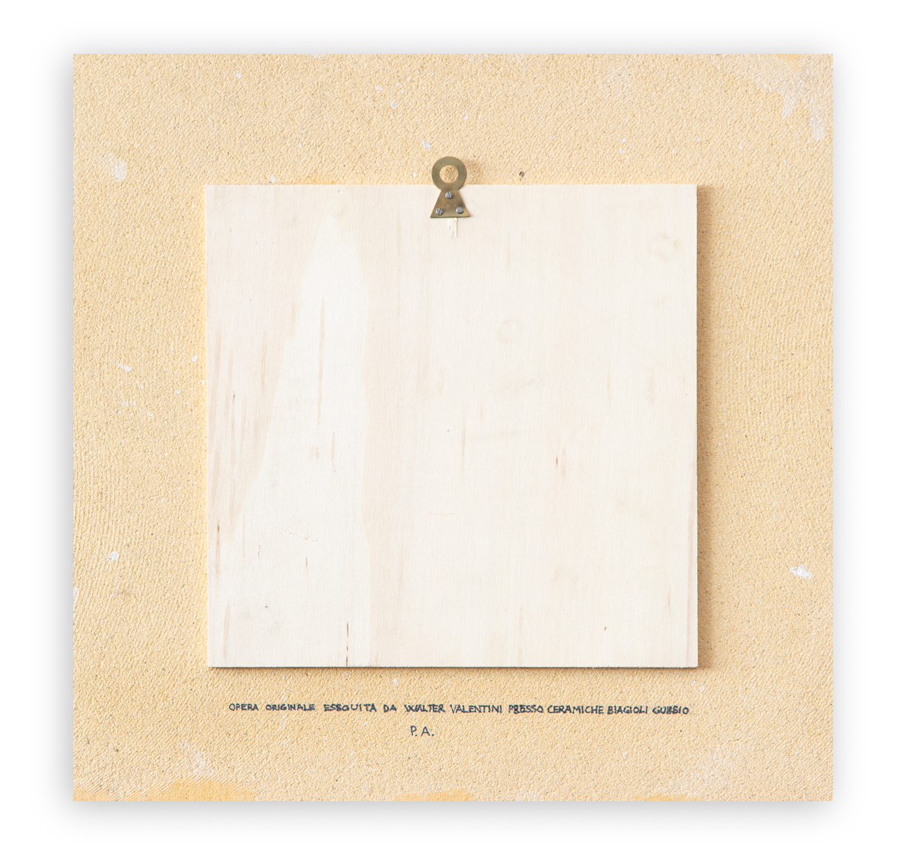 Iscrizione 'Opera eseguita da Walter Valentini presso le Ceramiche Biagioli Gubbio' al retro