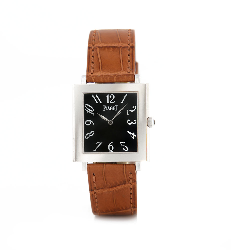 Dim. mm 29x29. C. slim, square-shaped 18K white gold with case back secured by screws (very good). D. black with painted Arabic numerals (very good). M. extra-plat, manual winding (very good). Dial, case and movement signed. Accompanied by Piaget strap and 18K white gold buckle.