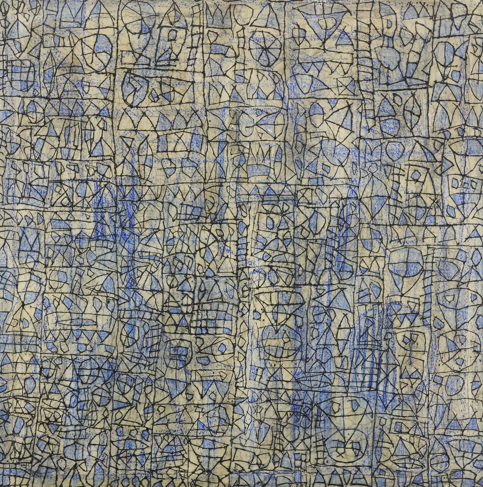 Olio, gesso, cera ed encausto su tela di iuta cm. 100x100 in teca di plexiglas