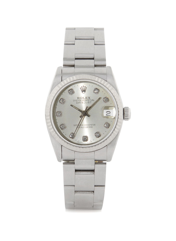 Diam. mm 30. C. stainless steel with screwed case back and crown, reeded white gold bezel and sapphire crystal (good). D. silvered with diamond indexes, centre seconds and date at 3 (original, very good). M. self-winding (very good). Stainless steel Oyster bracelet. Dial, case, movement and bracelet signed.