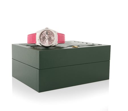 Cassa n. F625968 in oro bianco 18 kt con lunetta godronata e vetro zaffiro (come nuovo). Quadrante rosa floreale con due numeri arabi applicati, secondi al centro e data al 3 (come nuovo). Movimento a carica automatica (ottimo). Quadrante, cassa e movimento firmati. Completo di cinturino rosa e fibbia deployante in oro bianco 18 kt originali.