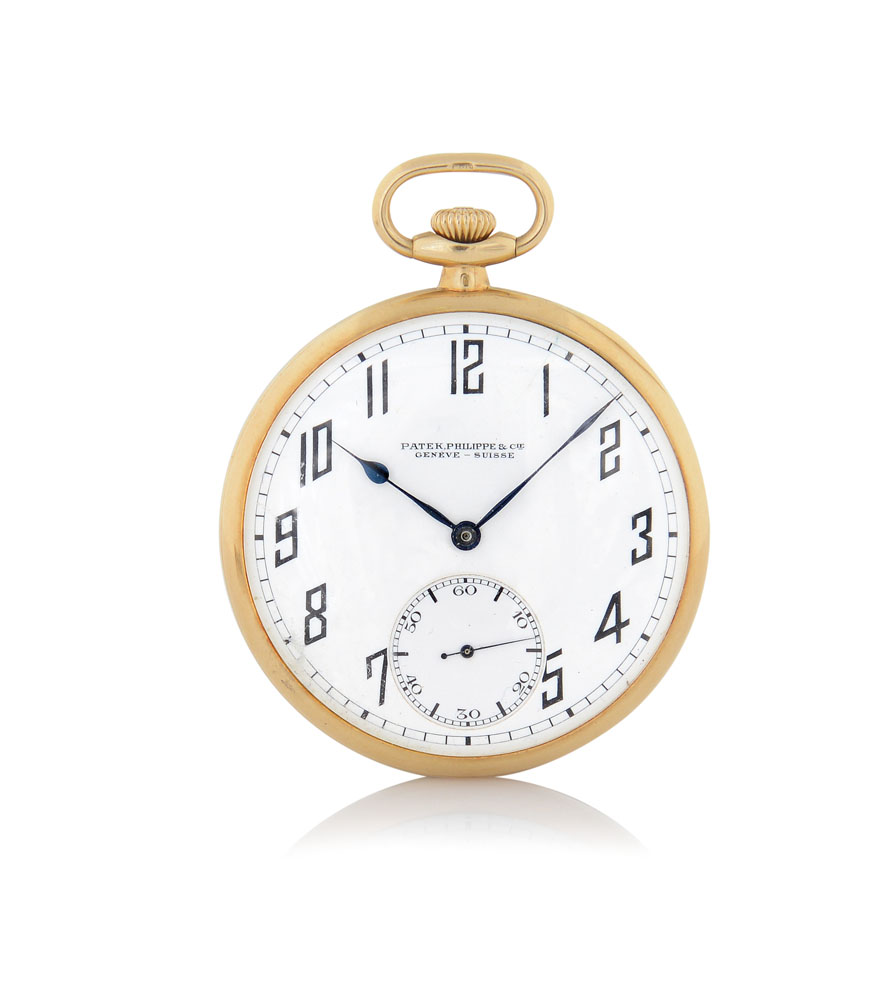 Diam. mm 48. C. openface, 18K yellow gold smooth (very good). D. white enamel with painted cubist-style Arabic numerals, subsidiary seconds (original, very good). M. anchor escapement, keyless dress (very good). Dial, case and movement signed. Accompanied by Extract from the Archives.