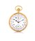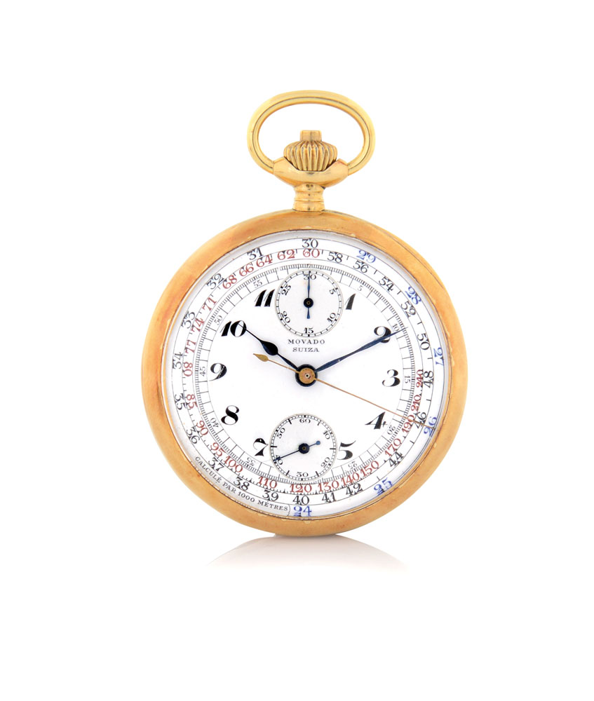 Cassa in oro giallo 18 kt incisa guillochè (buono). Quadrante in smalto con numeri arabi, secondi al 6 e contatore a 30 minuti al 12, scala tachimetrica a tre colori periferica (originale, ottimo). Movimento rodiato con scappamento ad ancora, carica manuale (ottimo). Quadrante e cassa firmati, movimento numerato.