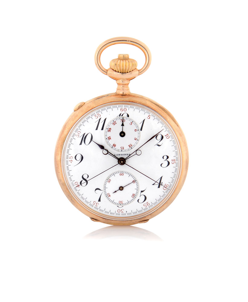 Diam. mm 47. C. openface, 18K yellow gold with round button through the crown and olive-shaped button between 10 and 11 (very good). D. white enamel with painted Arabic numerals, subsidiary seconds and 30 minutes register at 12, 60 minute/second division with red Arabic numerals (original, very good). M. rhodium.finished, keyless dress (very good). Dial and case signed, movement numbered.