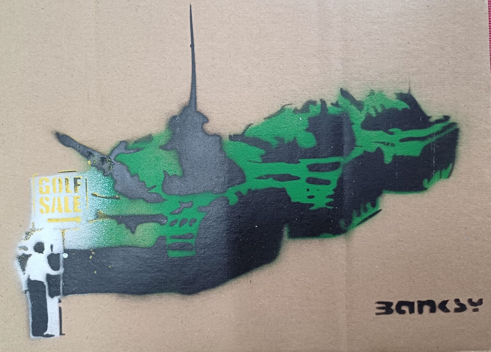 Firma a stencil in basso a destra, scritta e tiratura al verso: ‘Enjoy your free art!!!’ esemplare 3/5, timbro Dismaland Bemusement Park. Biglietto d’ingresso di Dismaland, Bemusement Park
